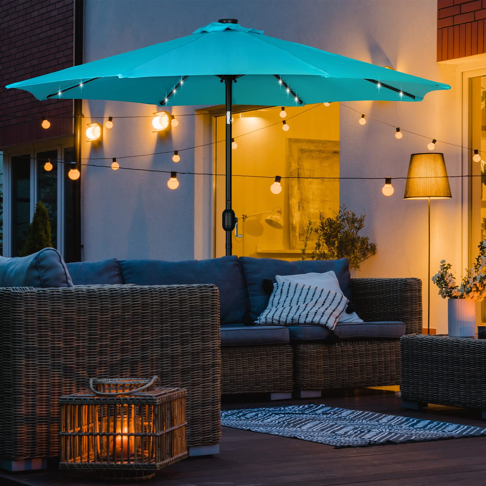 Amazon Com Paranta 9 Feet Outdoor Patio Umbrella With 40 Solar Led Lights Button Tilt And Crank 8 Ribs Patio Umbrella Peacock Blue Patio Lawn Garden